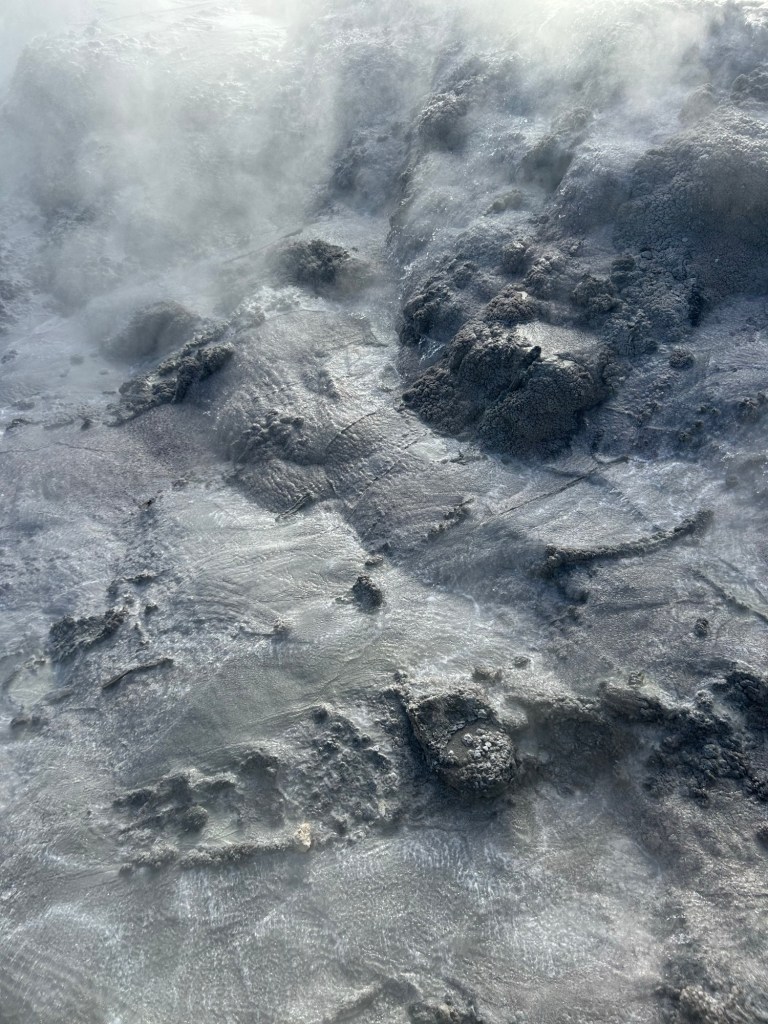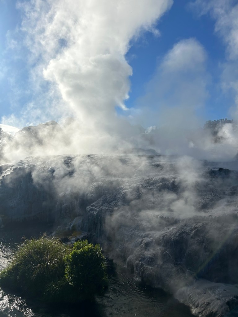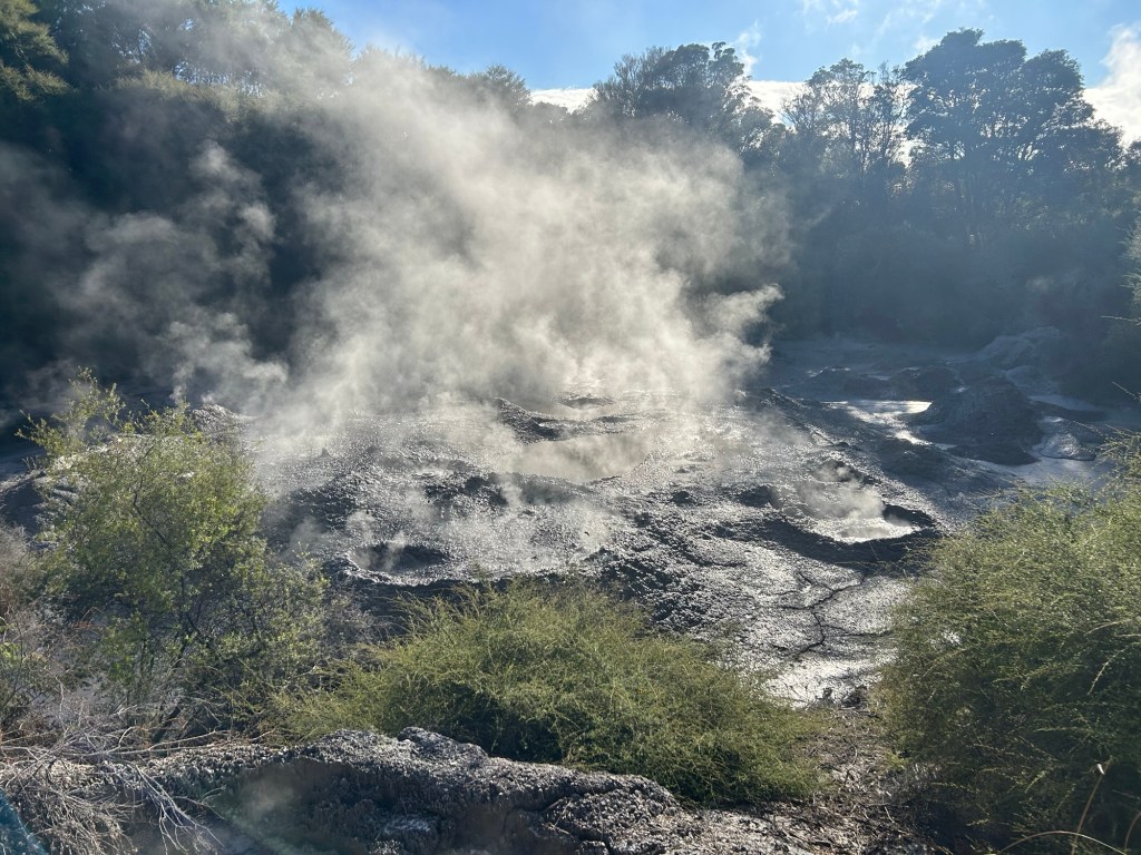 Kerry remarked that ‘It feels like the earth itself is alive in this country’, and I think that’s true. We arrived in Rotorua today, and as we drove in there was the smell of sulphur in the air and plumes of steam billowing up into the sky in the distance. Rotorua is a place of great significance to the Māori people and a concentration of volcanic activity. We visited the hot mud pools where bubbles popped and spat and watched the geyser spit gushes of steam into the sky. It was awesome, and ancient – like visiting the planet millions of years ago in its formation. And also very smelly!